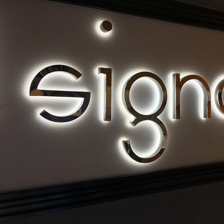 The backlit letter sign are fabricated front side stainless steel with return welded into 3D shapes. The reason why choose stainless steel is due to its flexibility and accuracy for bending and welding letter signs. Stainless steel could help the sign working longer, anti rust, and acid. The backlit letter sign backside normally comes with laser cutted acrylic base on design. Acrylic from backside has excellant light transmission. Inside of the letters there are led lights that lined into the letters. Pay attention to the lights layout as too long distance will make lights spot, too condense will make the signage very big power, not cost effective.